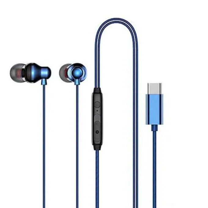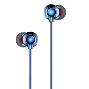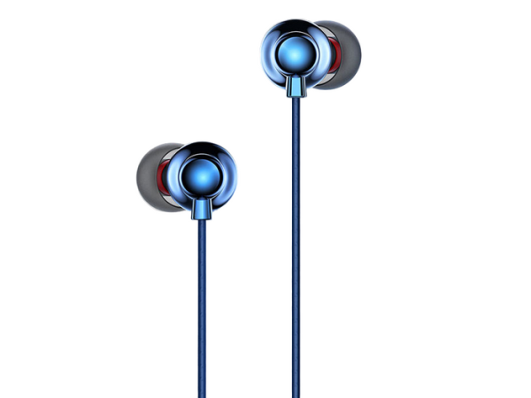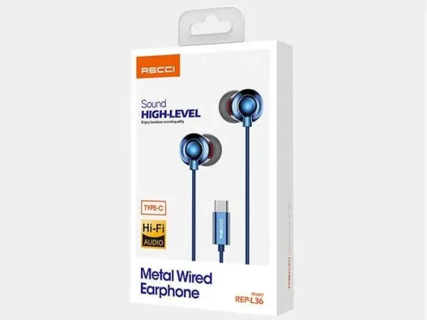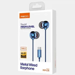 Recci REP‑L36 Blue are durable Type‑C wired in-ear earphones with 13 mm brass drivers for clear, balanced sound, metal housing, 120 cm cable, and extra silicone tips.