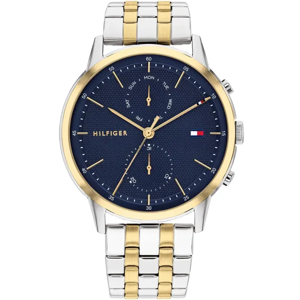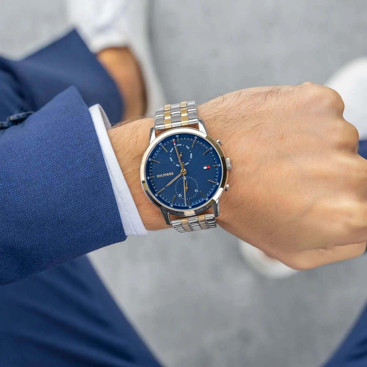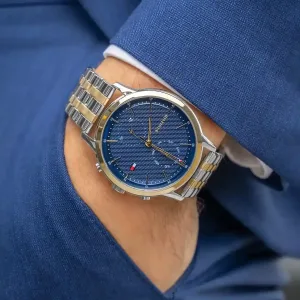 The Tommy Hilfiger Easton Men’s Watch (1710432) combines a 44mm stainless steel case, blue dial, and two-tone bracelet, offering day and date functions with quartz precision and 50-meter water resistance.